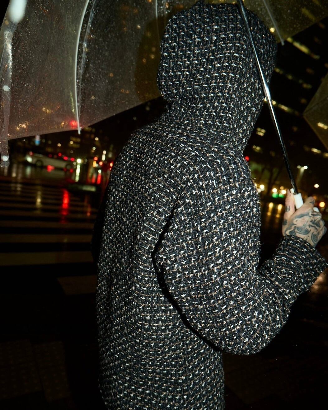 ツイード生地に意匠糸が織り込まれているファンシーツイードを使用したシャツフーディーです。